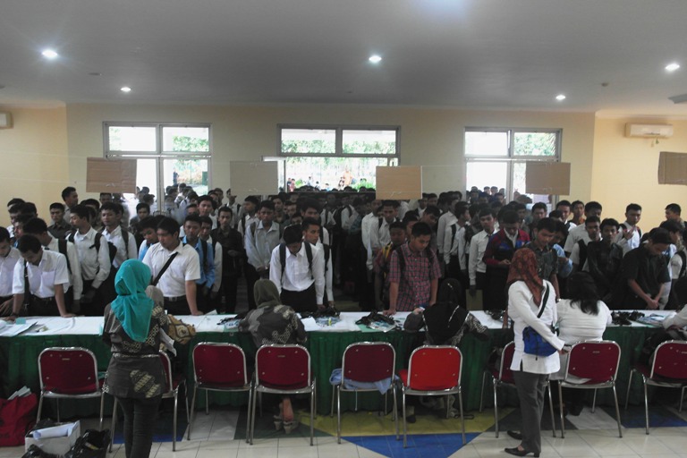 Proses registrasi adalah hal terberat dan terpenting yang harus kita lakukan. Persiapan untuk registrasi kita harus membagi daftar peserta lolos tes ke group-group kecil, membuat daftar hadir dengan tempelan foto, membuat co card dengan tempelan foto, melakukan konfirmasi identitas, dan menyelesaikan kasus-kasus yang ada, seperti peserta yang tidak membawa ID, ID tidak sama dengan info di pendaftaran dan kasus-kasus lainnya. Kami melakukan koordinasi terus menerus dengan klien (PLN) untuk memastikan kebijakan yang konsisten. Proses registrasi ini berlangsung dengan lancar dalam waktu kurang 1 jam, 630 orang bisa selesai di registrasi dan memasuki ruangan.
